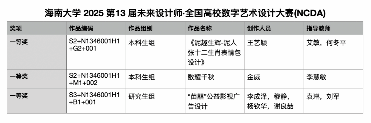 8月26日,第十三届“未来设计师·全国高校数字艺术设计大赛(NCDA)”评选结果揭晓。这是海南大学学子获奖名单。