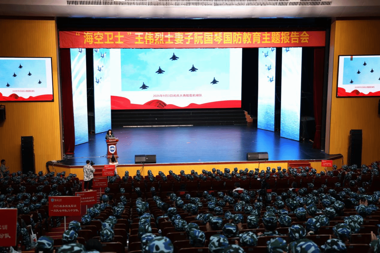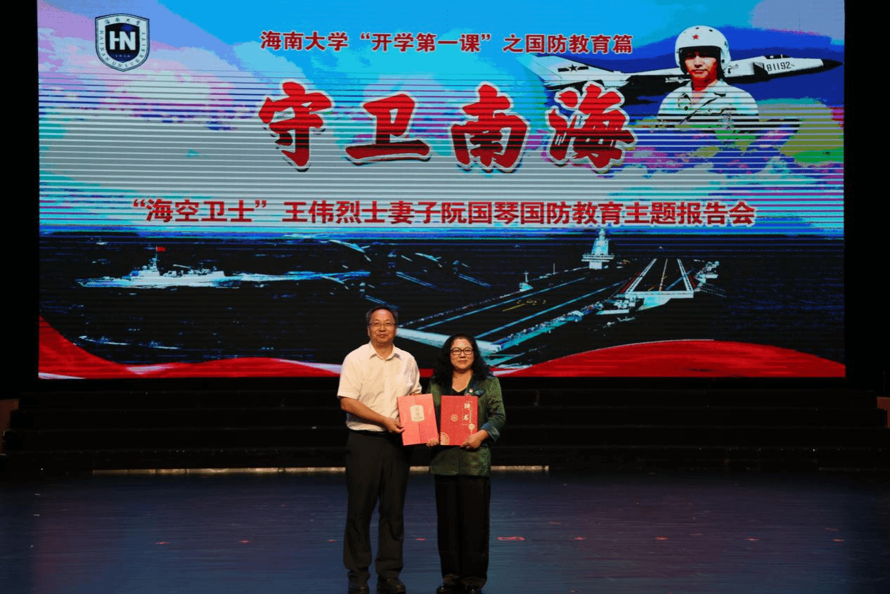 本站讯 (记者 杨梦娜 郑丹婷)天地英雄气,千秋尚凛然。9月8日晚,海南大学在思源学堂大礼堂举行“开学第一课”暨全民国防教育报告会,“海空卫士”王伟烈士妻子阮国琴受邀作国防教育主题报告,近千名师生现场凝神聆听,多次以持久掌声表达崇高敬意。