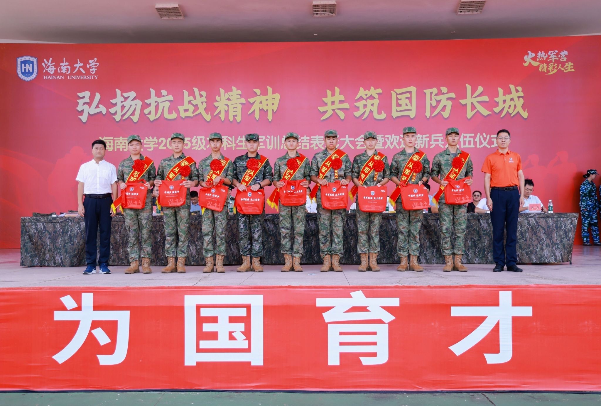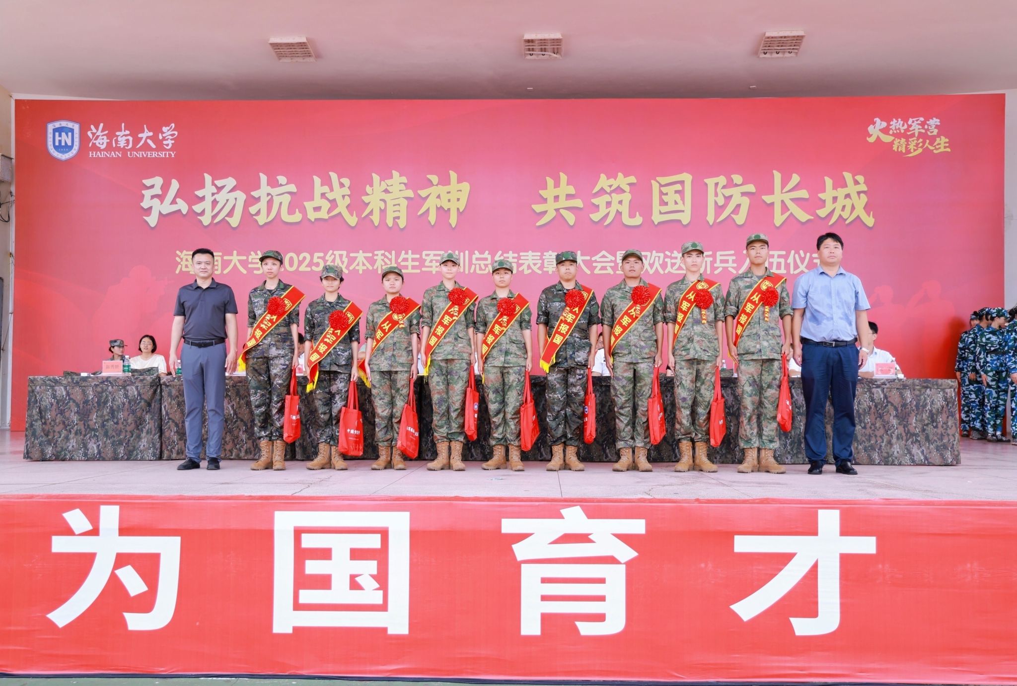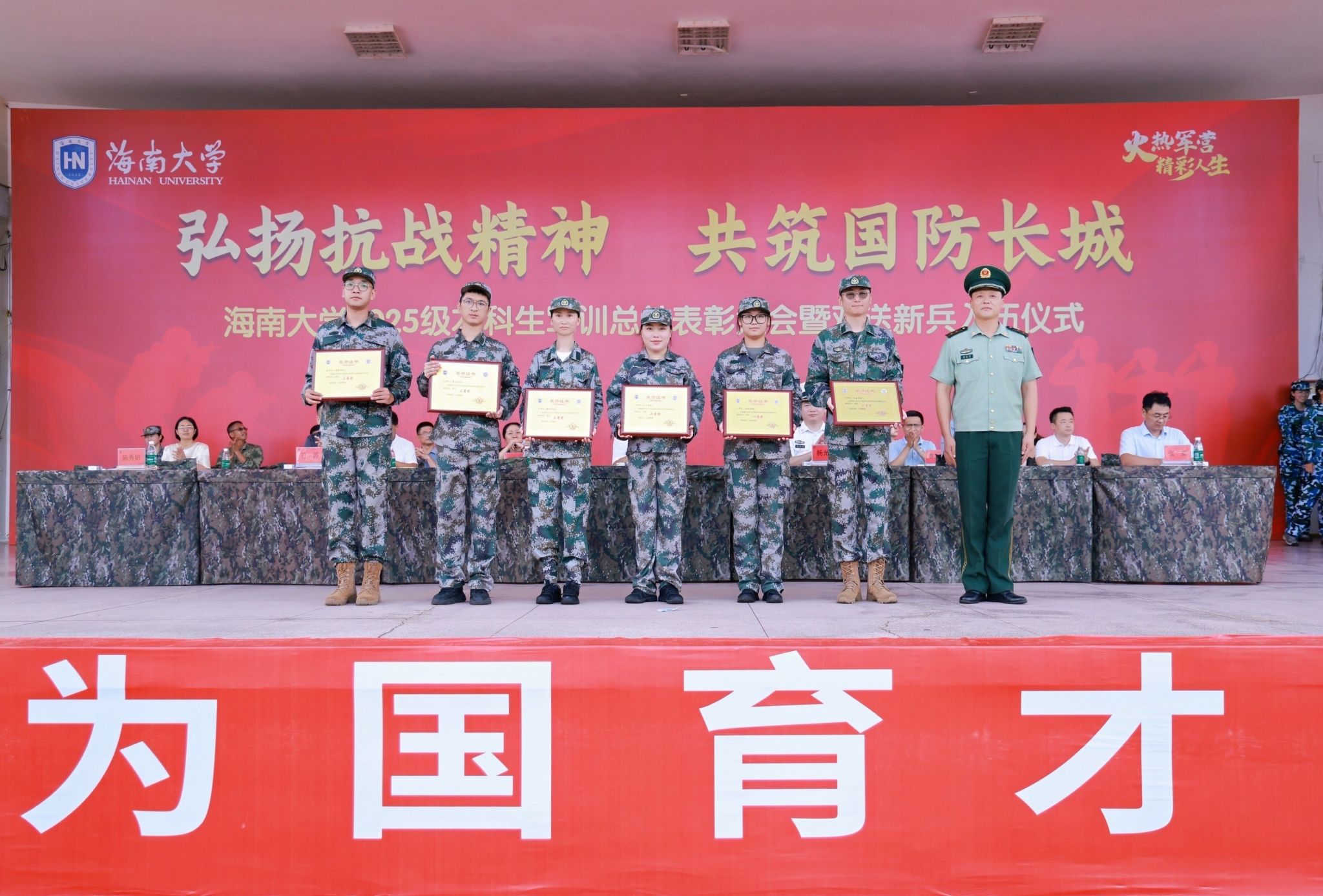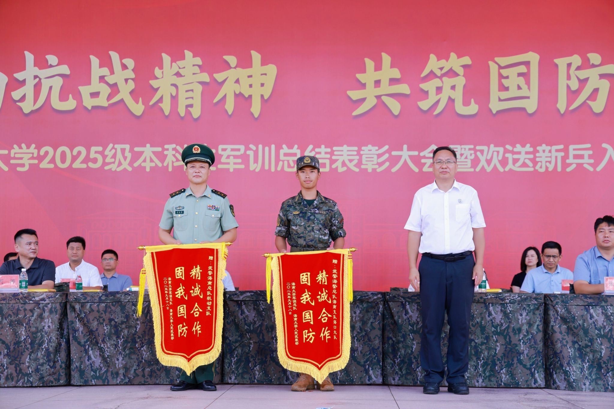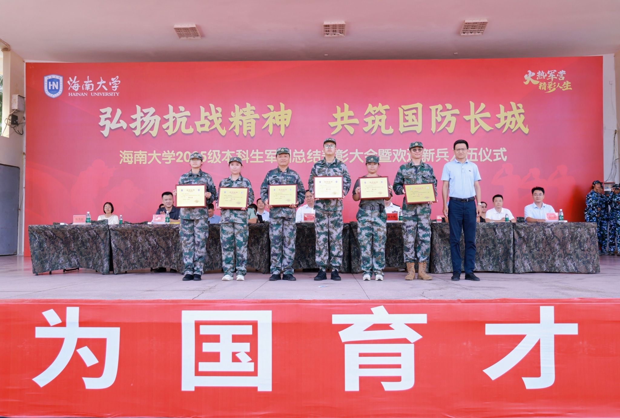 9月18日下午,海南大学2025级新生军训总结表彰大会暨欢送新兵入伍仪式在海甸校区举行。这是大会为队列会操获奖单位颁奖。学生工作部(处) 供图