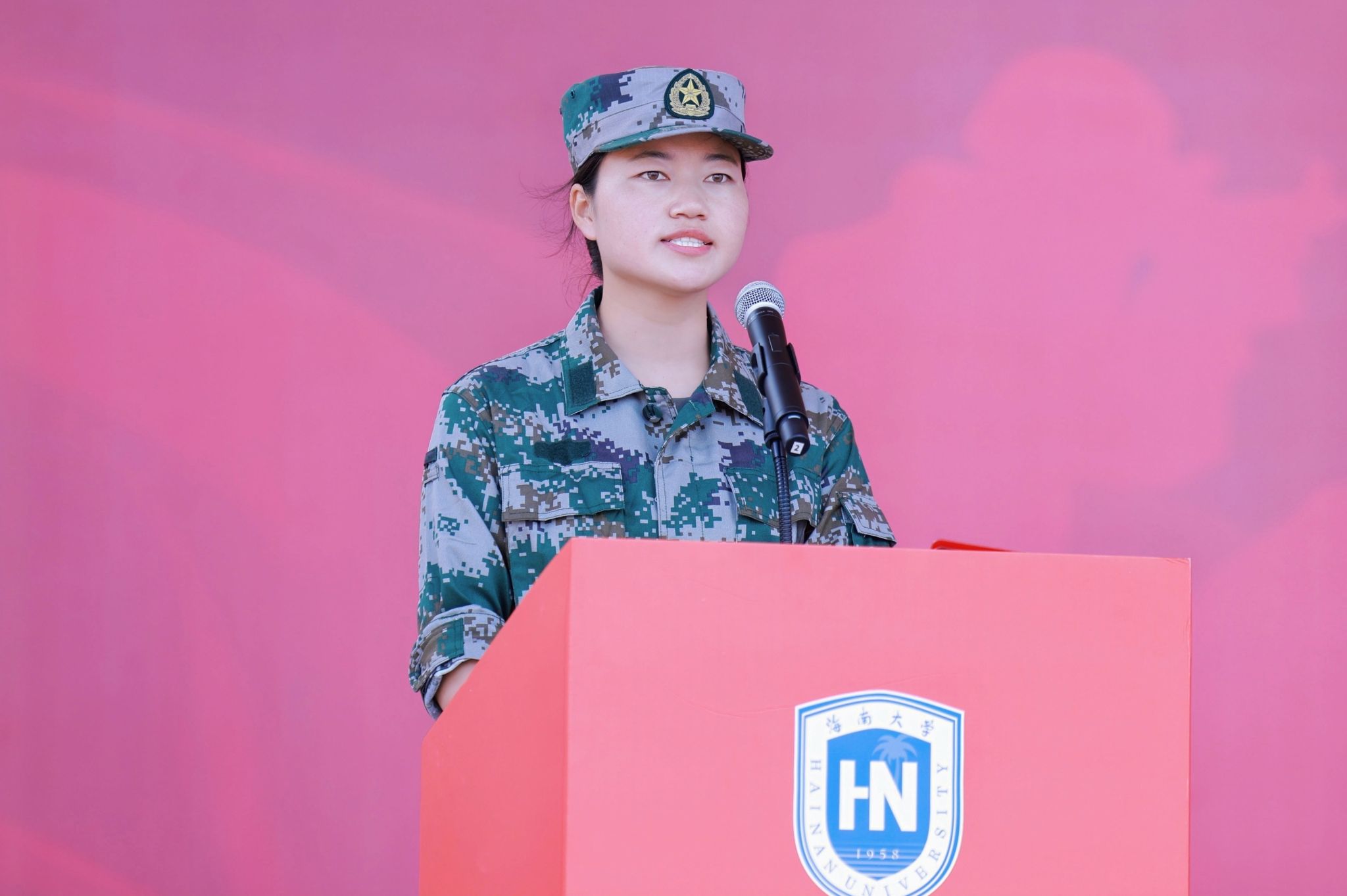 9月18日下午,海南大学2025级新生军训总结表彰大会暨欢送新兵入伍仪式在海甸校区举行。这是退役大学生代表杨宝玲发言。学生工作部(处) 供图