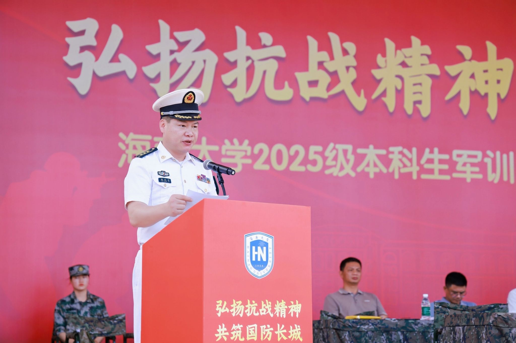 海南大学党委常务副书记张继友结合“九一八”历史事件,阐述了国防教育和强军使命的重大意义。他指出,军训不仅是一次体能和纪律的训练,更是一堂淬炼意志、厚植家国情怀的“必修课”。他勉励全体新生要铭记历史、珍视和平,从抗战精神中汲取奋进力量,将军训中扛过暴晒雨淋的坚韧,化为求学攻坚克难的动力;要践行担当、锤炼本领,扎实钻研专业知识,提升国防意识,在祖国需要时挺身而出;要锚定理想、融入大局,把“我的梦、海大梦”融入“强国梦、复兴梦、中国梦”之中,在学校“双一流”建设、海南自贸港发展和中国式现代化征程中,争做有理想、敢担当的时代青年。
