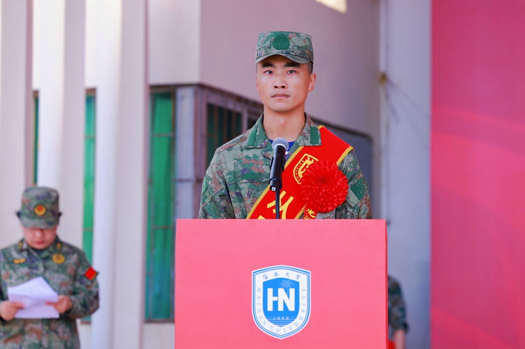 9月18日下午,海南大学2025级新生军训总结表彰大会暨欢送新兵入伍仪式在海甸校区举行。这是入伍新兵代表杨文康发言。学生工作部(处) 供图