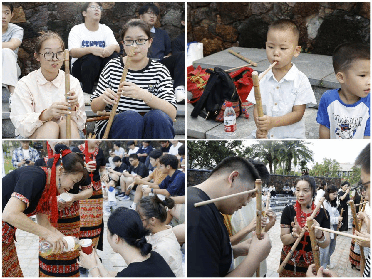 课堂现场,黎族民歌婉转动听,鼻箫与灼巴竹木乐器的合奏清脆悦耳,上课的学生端坐静听,路过的师生被悠扬乐声吸引驻足。大家纷纷用手机记录这充满生命力的歌声,不少同学围在传承人身边,跃跃欲试地尝试吹响竹木乐器。敬酒礼仪环节中,传承人唱起热情的祝酒歌,三位留学生接过传承人递来的山栏酒,在醇香中感受黎族文化的独特魅力。