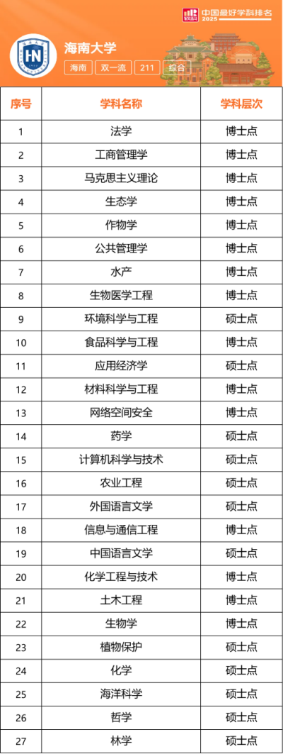 本站讯(通讯员 郭鑫)10月15日,2025软科中国最好学科排名揭晓。海南大学27个学科上榜,上榜学科数位列全国第60名,其中10个学科排名再上“新台阶”。法学、工商管理学等2个学科位列全国前12%;马克思主义理论、生态学、作物学、公共管理学、水产、生物医学工程等6个学科进入全国前20%(较2024年增加4个)。与2020年相比,生物医学工程、公共管理学、环境科学与工程、药学、网络空间安全等5个学科实现五档及以上提升。