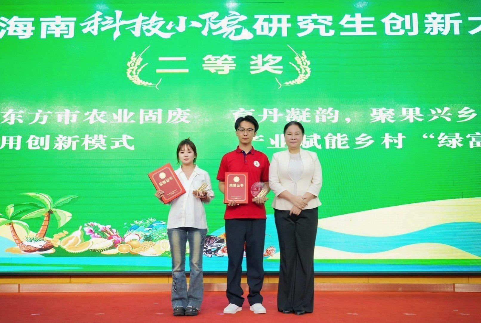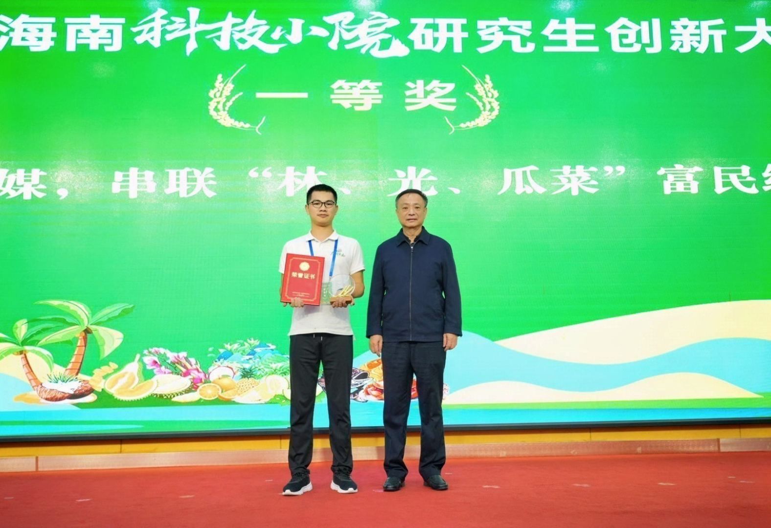 11月25日,海南科技小院研究生创新大赛决赛暨颁奖仪式在海口举行。省科学技术协会党组书记、副主席许振凌为二等奖获奖团队颁奖。