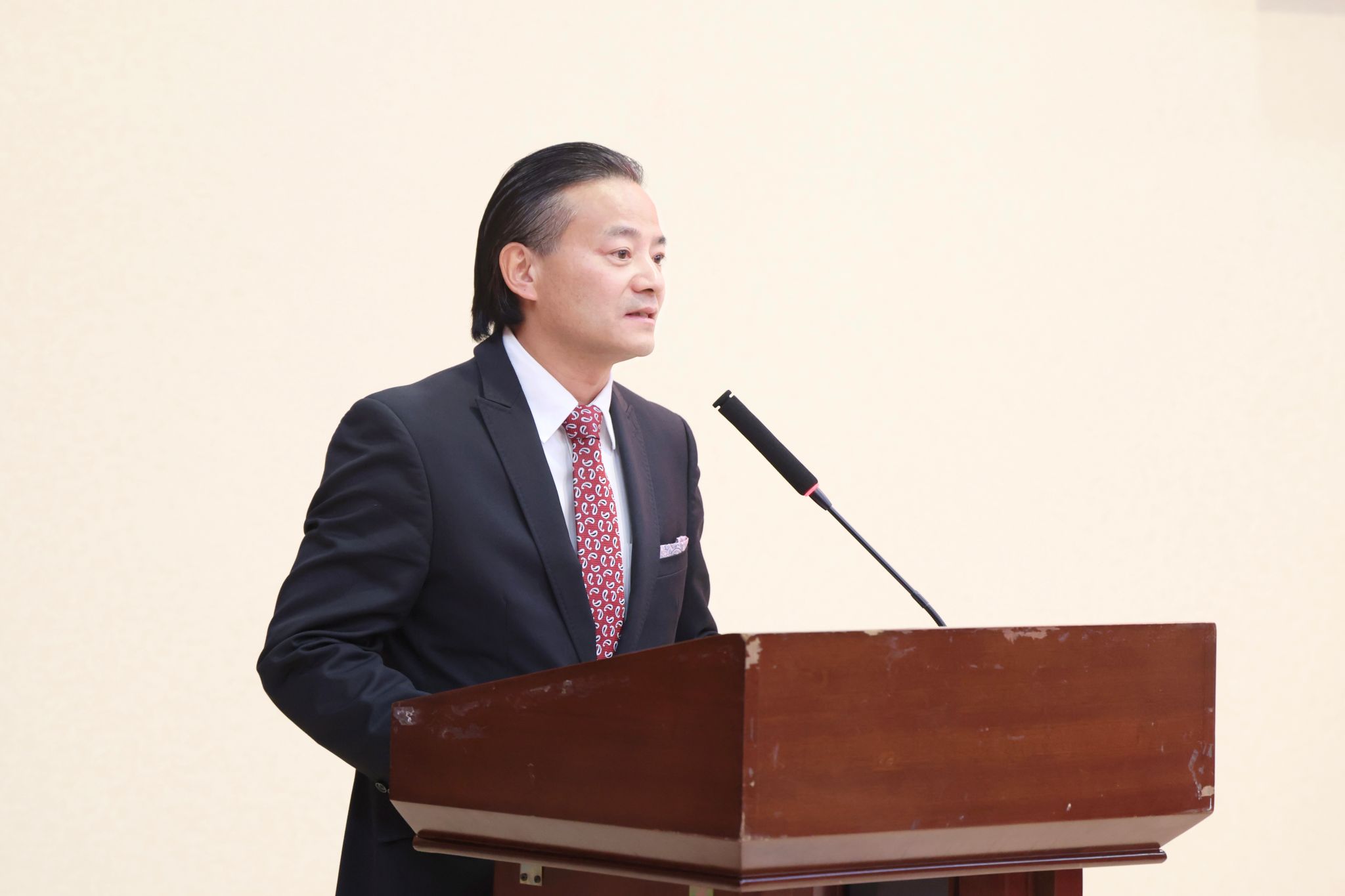 12月9日上午,《习近平谈治国理政》多语种书籍捐赠仪式在海南大学思源学堂多功能厅举行。余富文讲话。段添月 摄
