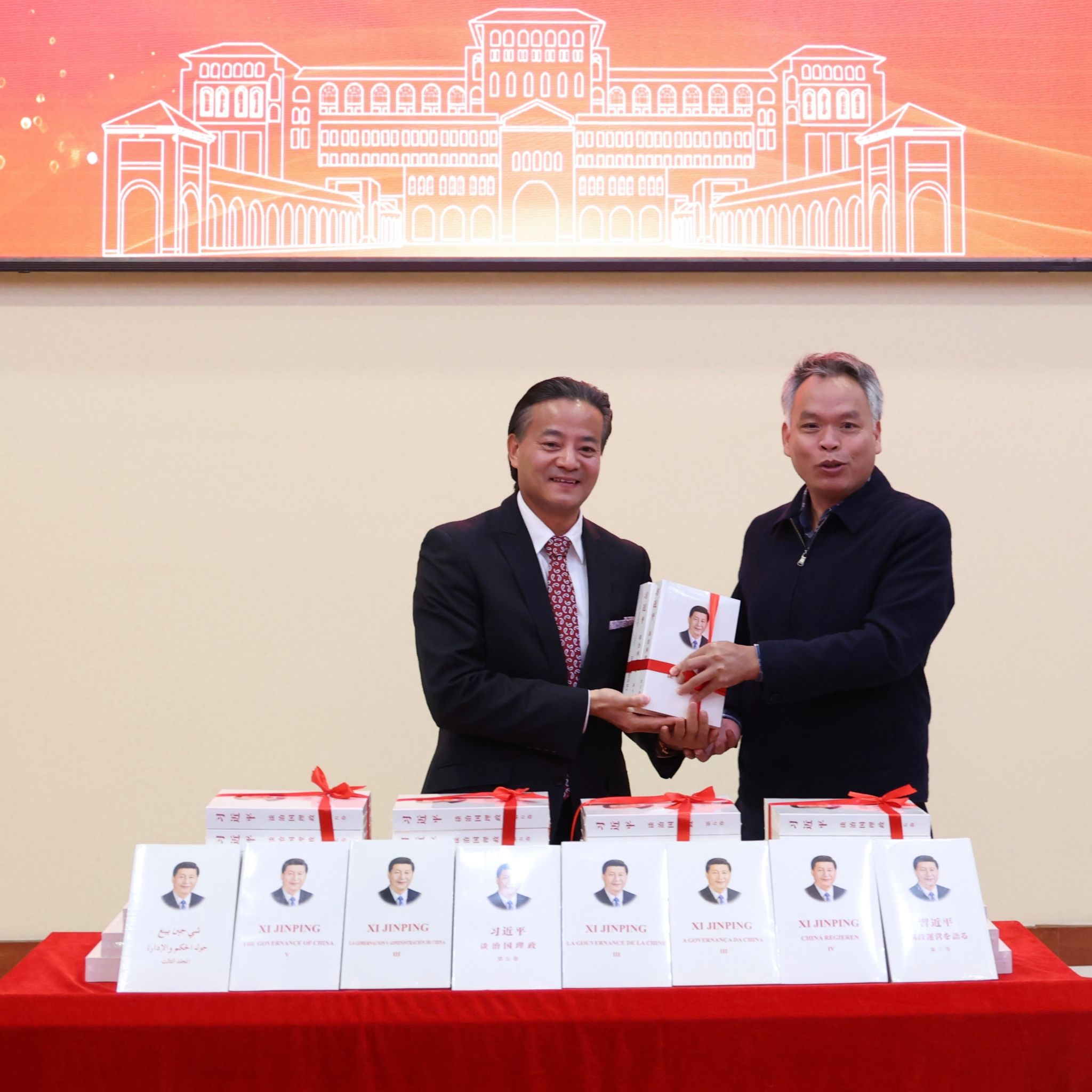 余富文在致辞中介绍了《习近平谈治国理政》系列图书的发行和翻译情况,他表示,《习近平谈治国理政》多语种书籍,是国际社会了解当代中国的重要窗口,也是寻找中国问题答案的一把钥匙。此次捐赠图书希望能助力学校开展师生思政、国际合作交流等工作,学习“新理念、新思想、新战略”。希望双方加强深度合作,共同携手讲好中国故事,为实现中华民族伟大复兴的中国梦作出应有贡献。