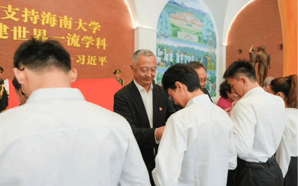 12月18日上午,海南大学2025年新党员入党宣誓仪式暨“奋进自贸港 丹心耀南疆”主题党日活动在校史馆举行。李湖、谭基虎、张继友和老党员代表陈封椿、吉布彦、陈传汉、李鸿然、庞京城为新党员代表佩戴党员徽章。周铭轩摄