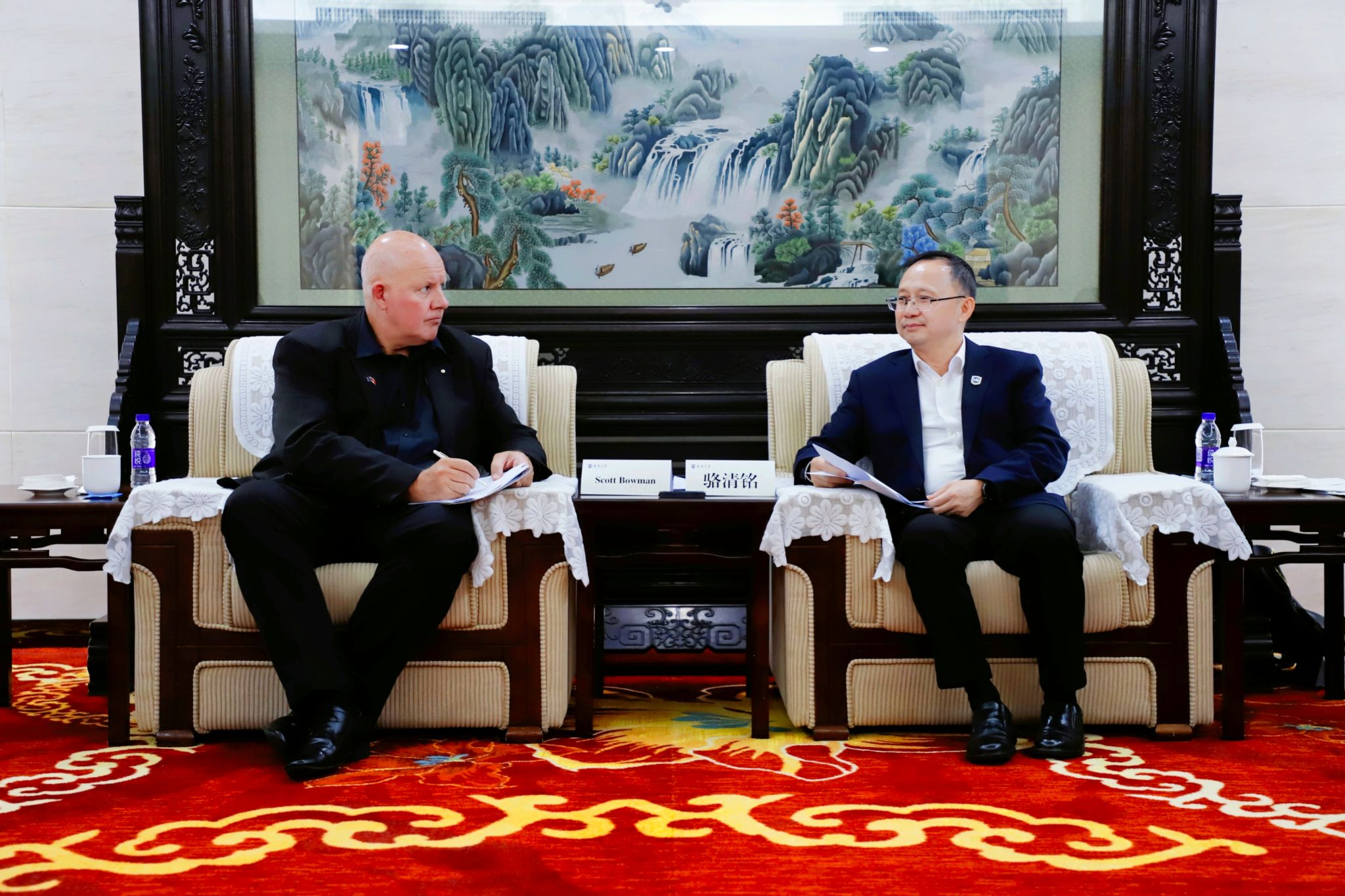 骆清铭对斯科特·鲍曼一行的到来表示热烈欢迎,并围绕学科建设、人才培养、科研创新、国际合作与办学条件等方面介绍了海南大学的发展情况。他表示,近年来,学校实力显著增强,多项核心指标进入全国前列,正朝着世界一流大学的目标奋力迈进。学校通过牵头组建热区高校联盟,承担多项国家科研任务,同时将自身科研成果推广至其他热带地区应用,为区域发展贡献海大力量。希望以此次交流为契机,双方互学互鉴,深化合作,共同推动人才培养和技术创新。