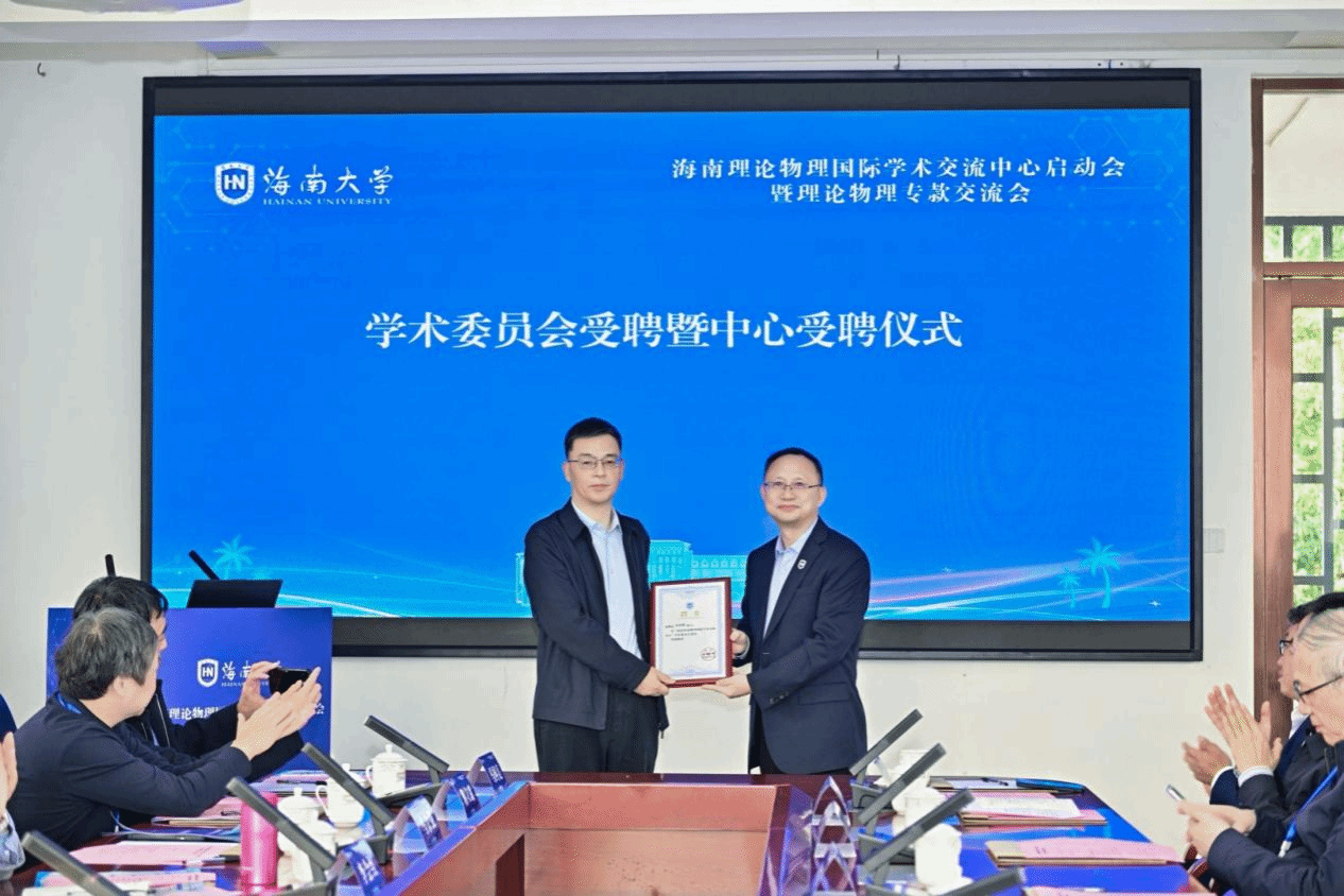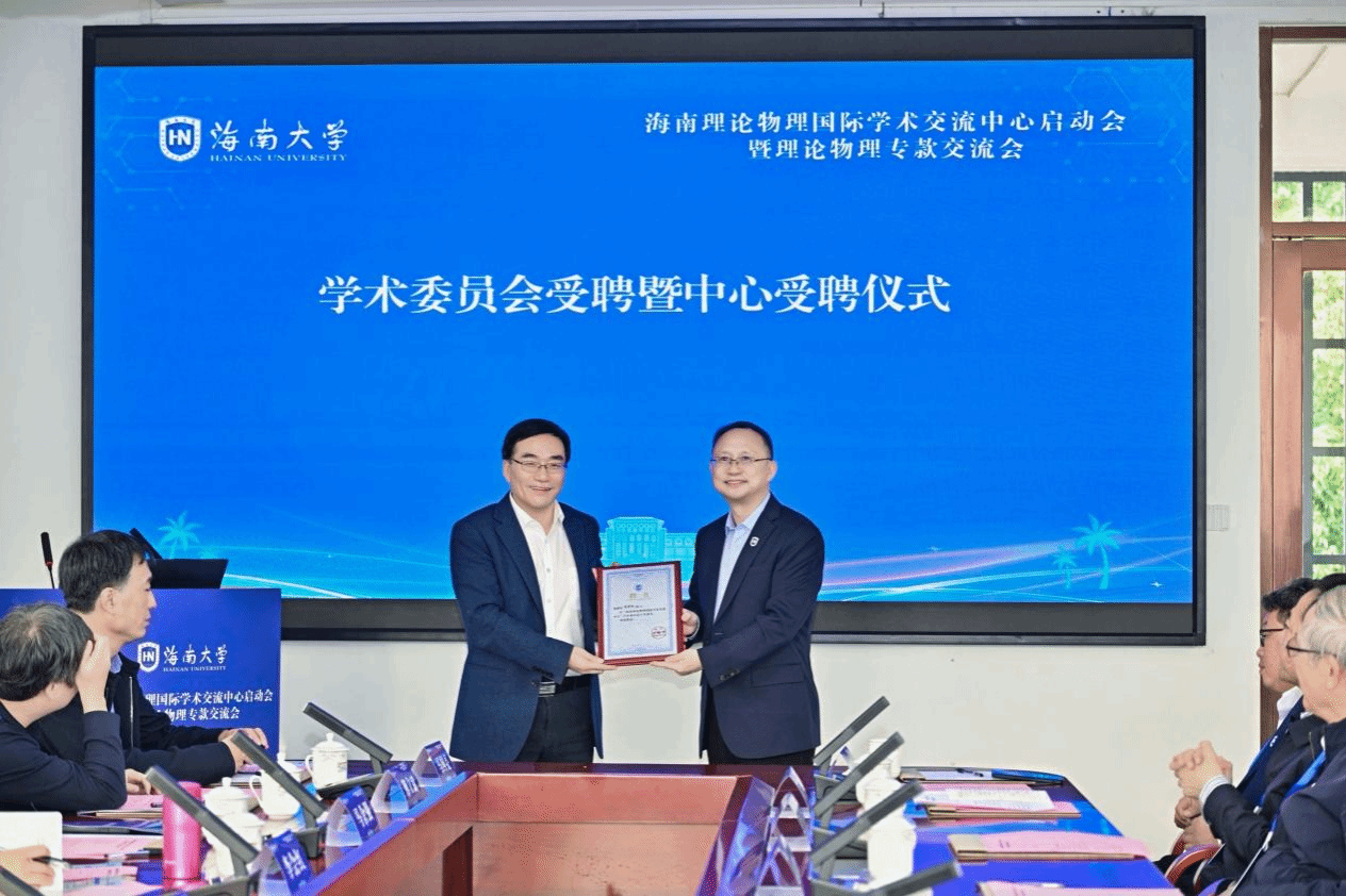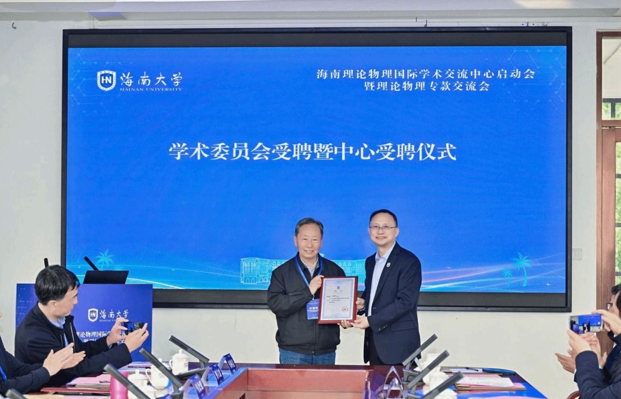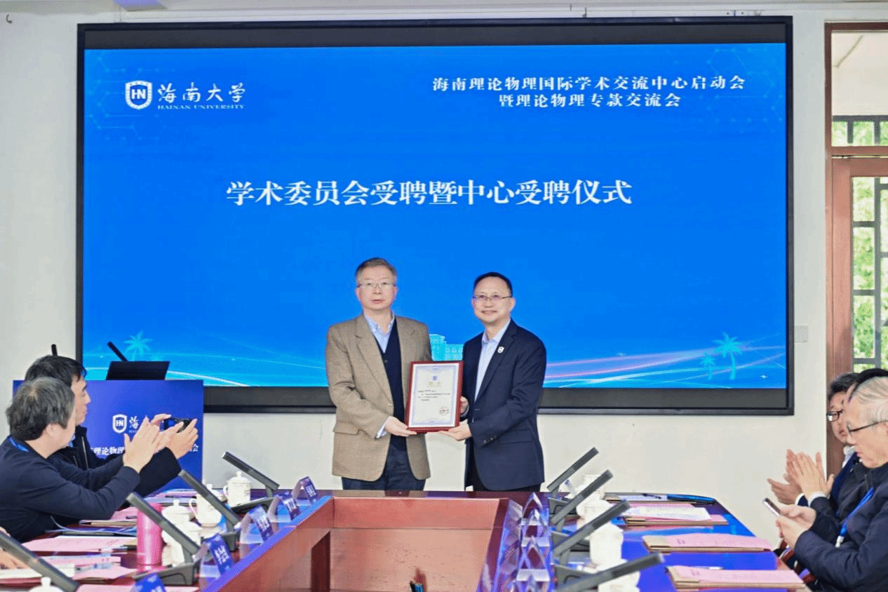 1月28日上午,海南理论物理国际学术交流中心启动会暨理论物理专款交流会在泰坚楼会议室举行。骆清铭为蔡荣根颁发聘任证书。宣传部 摄