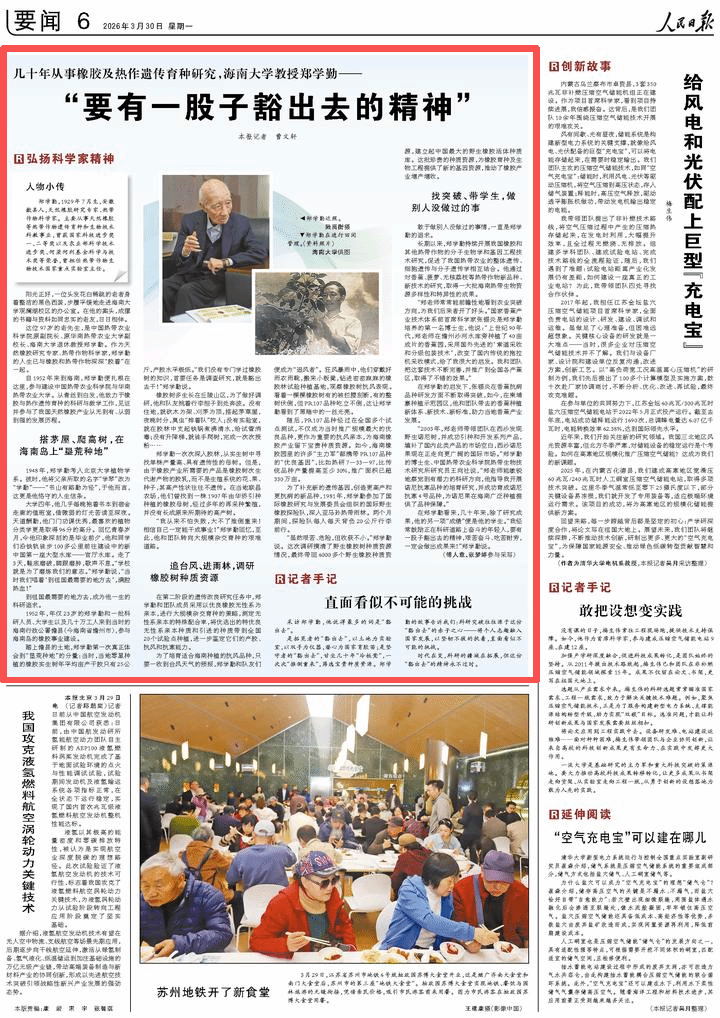 是拓荒者的“豁出去”,以土地为实验室,以双手为仪器,潜心为国家育胶苗;是坚守者的“豁出去”,甘坐几十年“冷板凳”,一次次“推倒重来”,筛选宝贵种质资源。郑学勤的故事告诉我们:科研突破往往源于这份“豁出去”的赤子之心——将个人志趣融入国家发展,以坚韧不拔的执着,直面看似不可能的挑战。