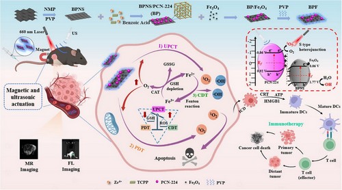 针对该研究难点,吴锡龙团队设计构建了一种光/声/磁三重响应的三元异质纳米晶平台。在结构设计层面,该平台创新引入S型异质结架构,通过黑磷与金属有机框架材料在界面自发形成内建电场,引导电荷载流子定向分流,使超声激发下单线态氧产量提升至单一材料的数倍。同时,团队引入超顺磁性四氧化三铁,兼具芬顿反应催化、缓解肿瘤缺氧、磁靶向及磁共振成像等多重功能。在药物递送层面,团队采用磁场与超声“双引擎”驱动策略。磁场引导纳米平台精准富集于肿瘤区域,超声波则通过机械效应松动致密组织,帮助药物实现深层渗透。