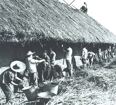 在第一张照片中,一位穿着白色背心的男子挽起裤脚,专注地修整着土墙;第二张照片里,一片荒地上,一群人挥锄铲土,场面繁忙而热闹;第三张照片定格了众人协作的场景:有人给房顶铺上茅草,有人修整土墙;第四张照片中,一人弯腰握着锄头,仔细平整着茅草房旁的地面。浏览这组珍贵的老照片,简陋的工具与热火朝天的劳动景象形成了鲜明对比。