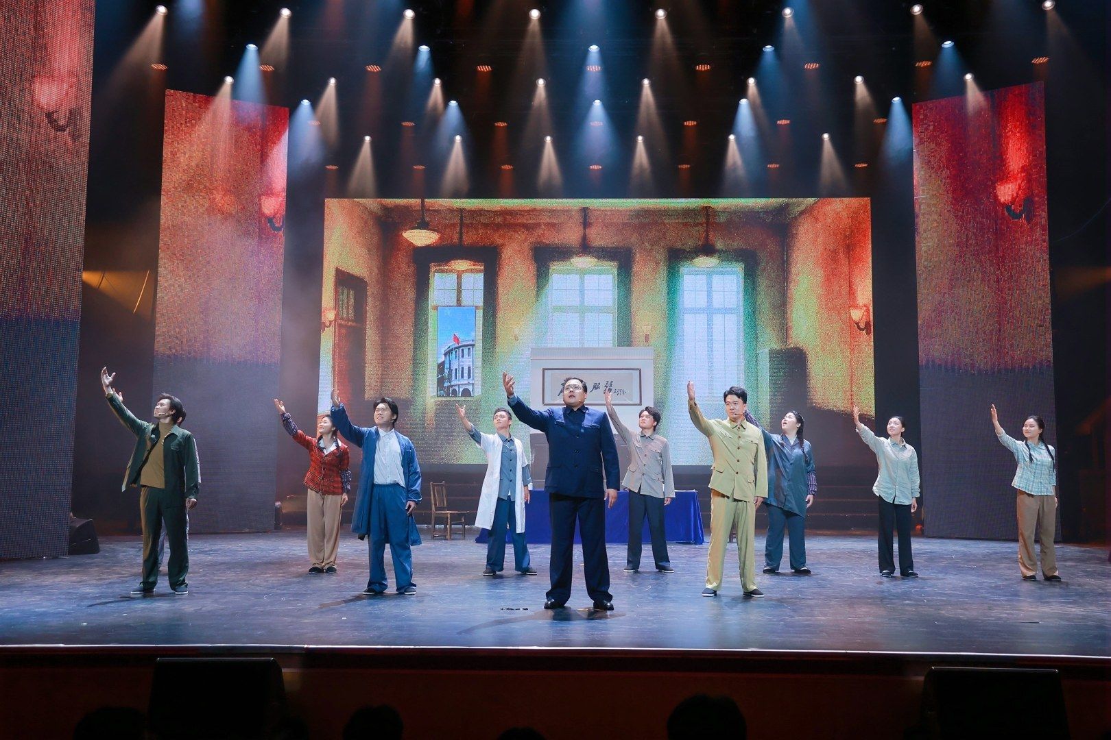 4月12日晚,海南大学原创音乐剧《丹心耀南疆》在思源大礼堂震撼上演。全体合影。