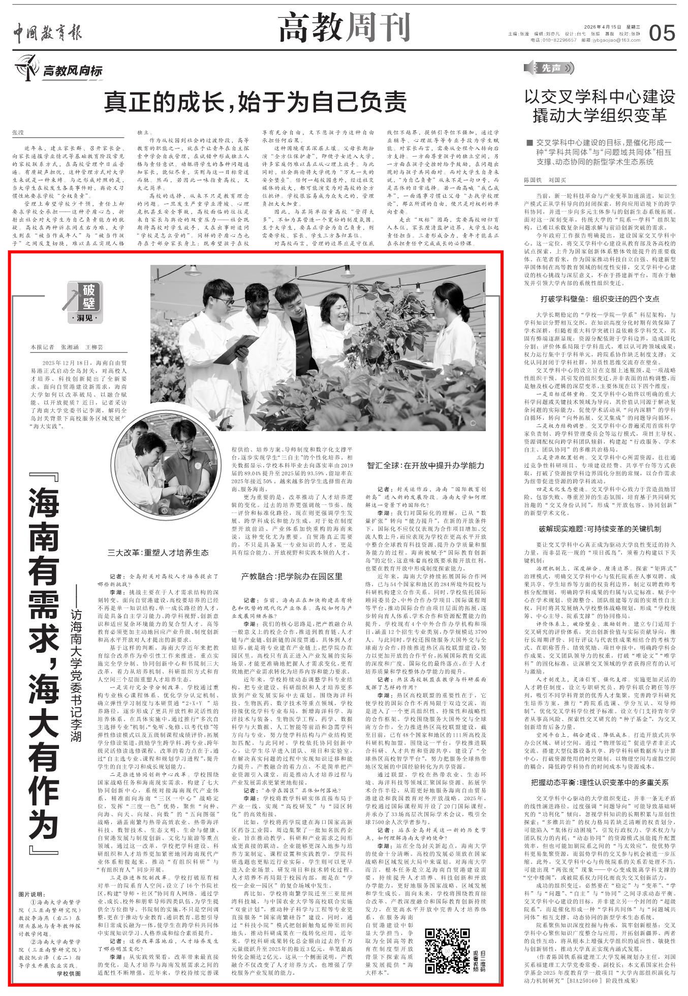 (作者:《中国教育报》记者 张湘涵 王柳芸)2025年12月18日,海南自由贸易港正式启动全岛封关,对高校人才培养、科技创新提出了全新要求。面向自贸港建设新需求,海南大学如何以改革破局、以融合赋能、以开放提质?近日,记者采访了海南大学党委书记李湖,解码全岛封关背景下高校服务区域发展的“海大实践”。