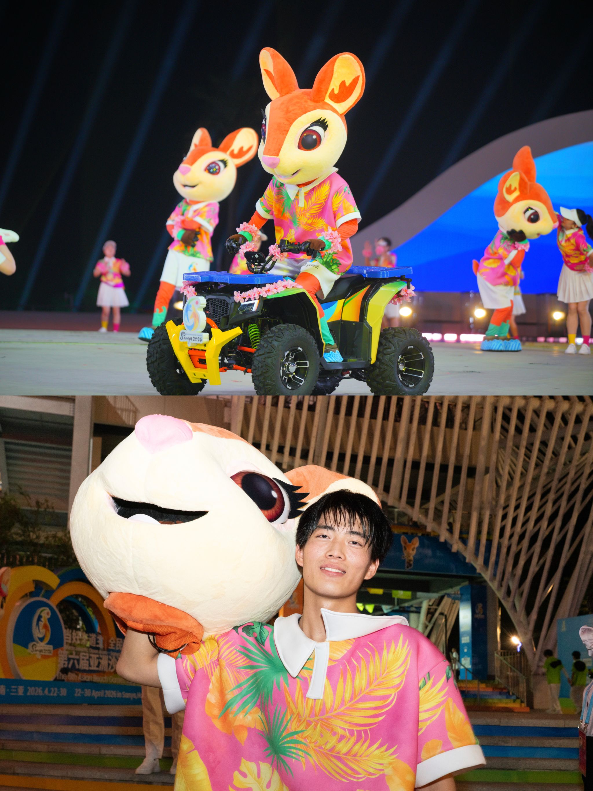 4月22日晚,第六届亚洲沙滩运动会在三亚开幕。海南大学2025级服装表演专业本科生张书豪在开幕式上化身赛事吉祥物“亚亚”。谢璐 王杰 摄