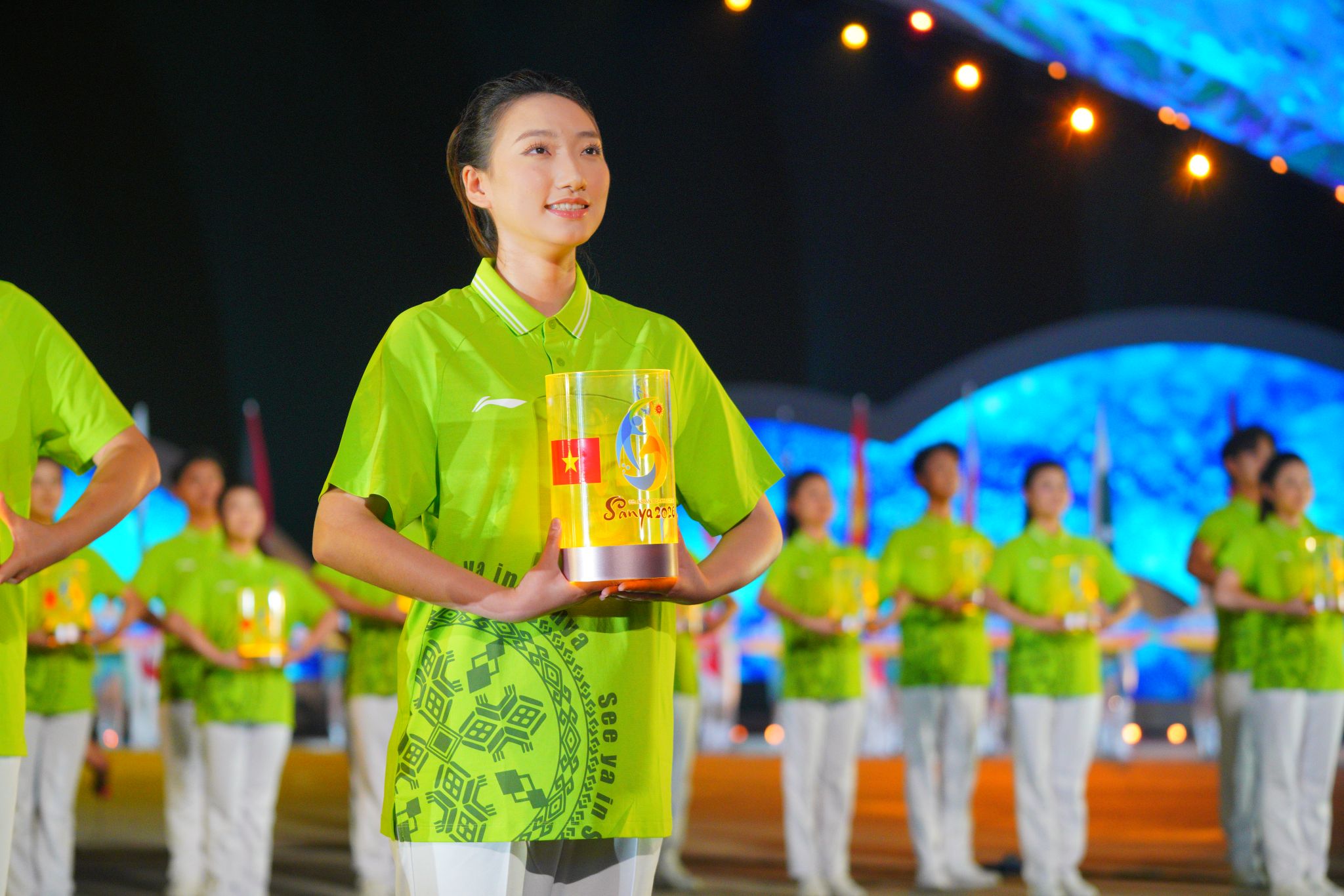 4月22日晚,第六届亚洲沙滩运动会在三亚开幕。海南大学2023级服装表演专业本科生蔡圳参与开幕式“汇沙成徽”环节。谢璐 摄