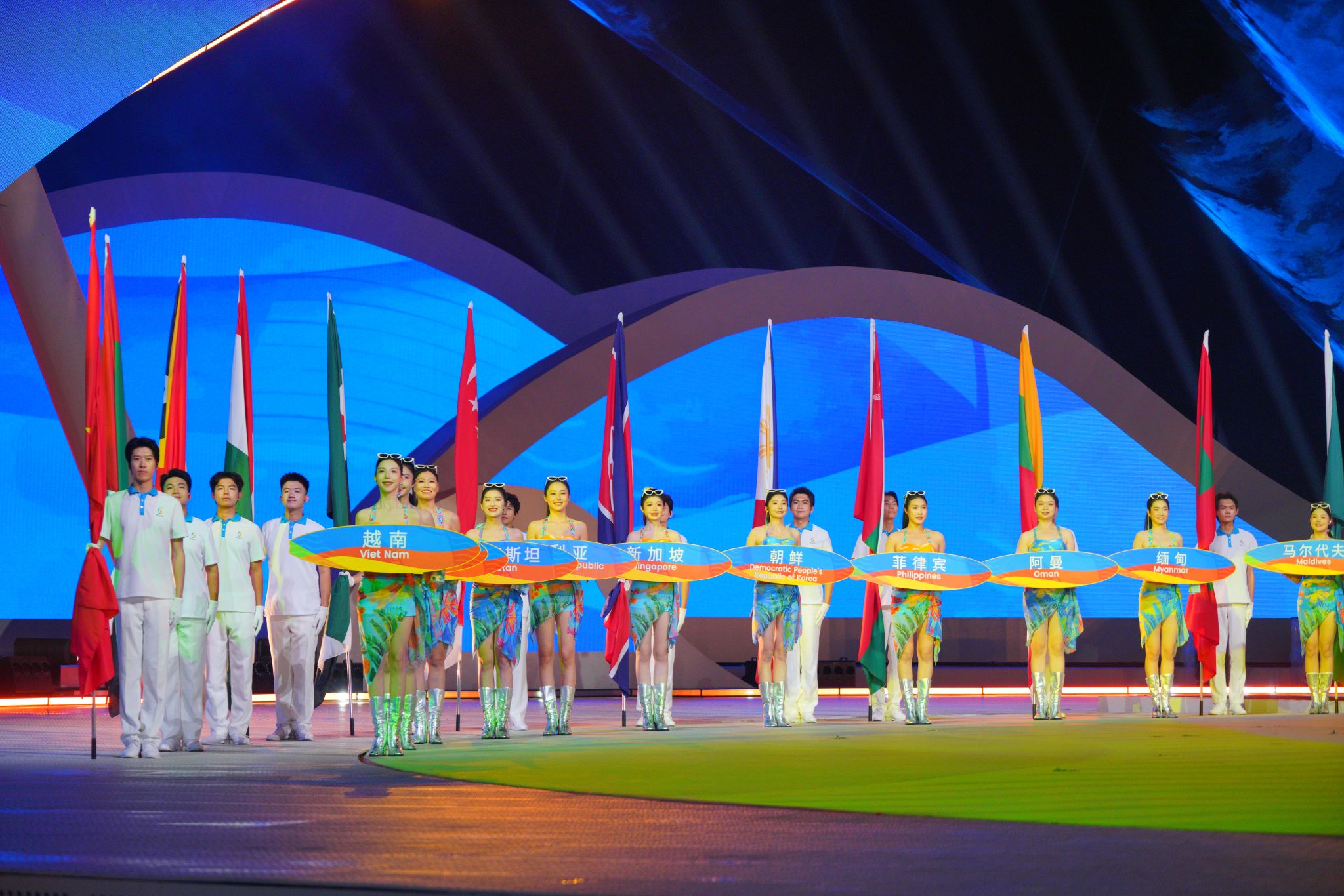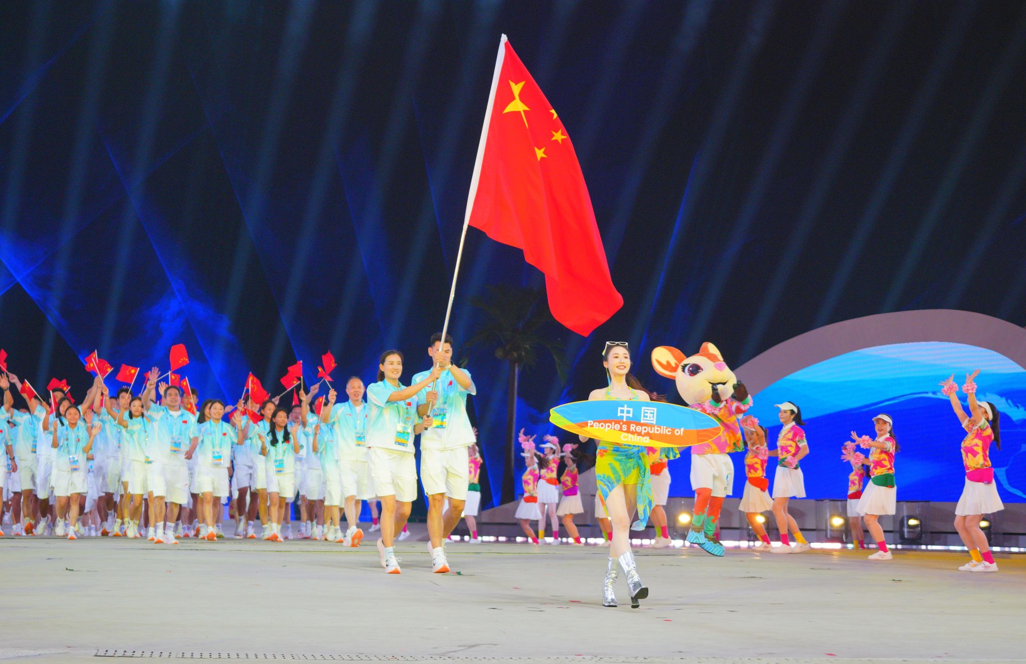 4月22日晚,第六届亚洲沙滩运动会在三亚开幕。海南大学2023级服装表演专业本科生朱声琪担任中国代表团引导员。谢璐 摄