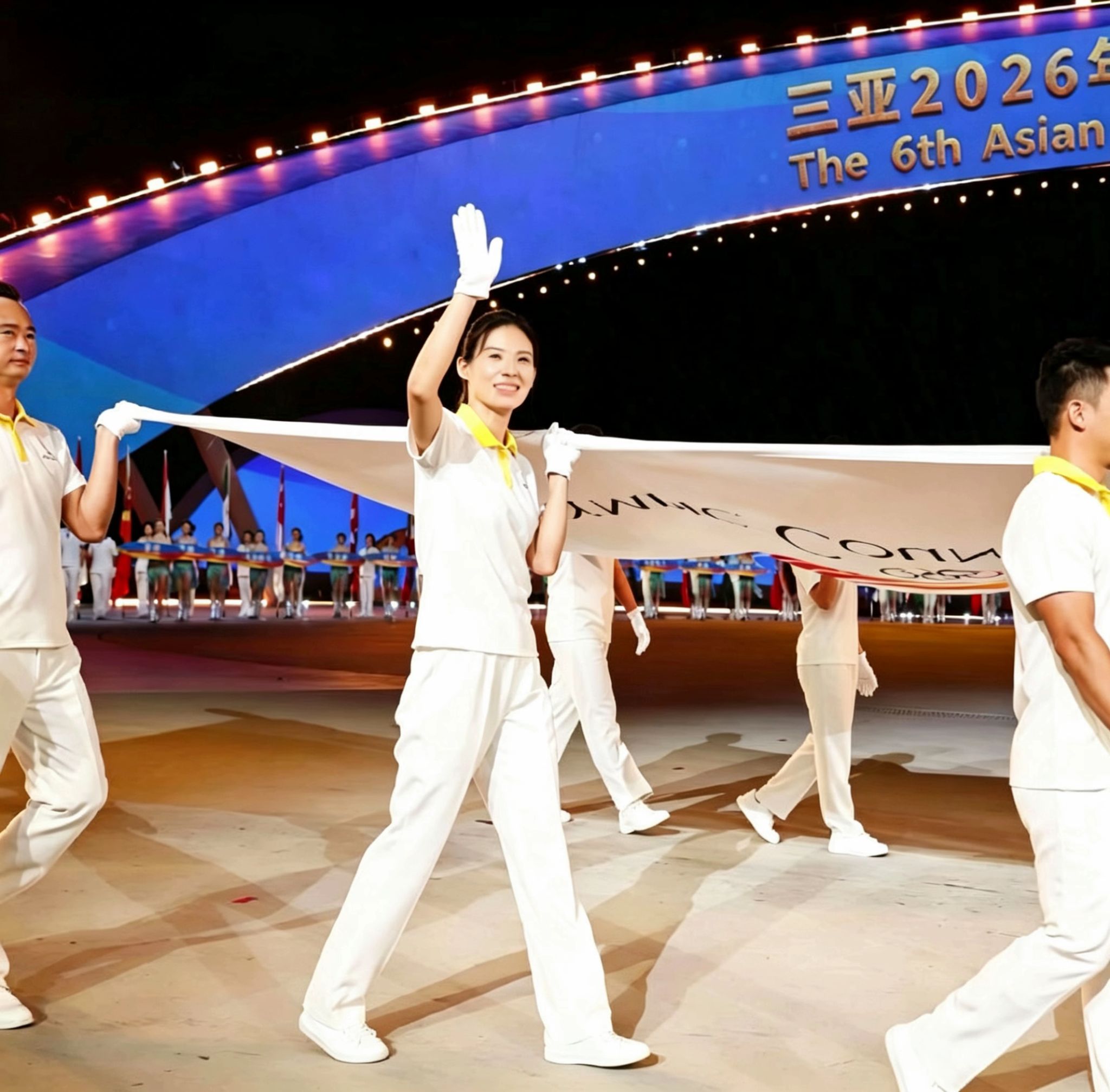 2023级服装表演专业本科生朱声琪肩负中国代表团引导员任务,她和其他28名海大引导员一起身着海南特色服饰,迈着自信昂扬的步伐,面带热情洋溢的笑容,高举椭圆形引导牌,有条不紊地引导各运动员代表团有序入场,用优雅姿态展现海大青年的风采;2025级服装表演专业本科生王永震在第六届亚洲沙滩运动会开幕式上担任旗帜标兵。他与其他22名海大旗帜标兵并肩而立,身姿挺拔如松,始终保持昂扬向上的精神姿态,用每一个坚定的身影,展现出海大青年朝气蓬勃、奋勇担当的精气神;2025级服装表演专业本科生张书豪,在开幕式上化身赛事吉祥物“亚亚”,他驾驶沙滩摩托灵活穿梭于会场之间,以活泼灵动的舞姿传递着赛事的喜悦与活力,成为现场最具感染力的“快乐符号”;2023级服装表演专业本科生蔡圳参与开幕式“汇沙成徽”环节,她神情专注、动作娴熟,与其他志愿者伙伴们手捧沙粒相向而行,在现场激光雕刻技术的巧妙配合下,将细碎沙粒汇聚成清晰的三亚亚沙会会徽标识,诠释着“聚沙成塔、共赴盛会”的美好寓意。