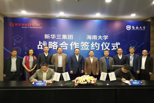 本站讯(通讯员 戴惟萌)12月25日,海南大学与紫光集团旗下的新华三集团在北京签署战略合作协议。双方将在人才培训、学科建设、科研成果转化等方面进行全方位交流与合作。海南大学校长骆清铭、副校长陈险峰、傅国华,紫光股份总裁王竑弢、新华三集团副总裁傅强、紫光股份高级副总裁谢筱华、紫光软件总经理李翔宇等出席签约仪式。