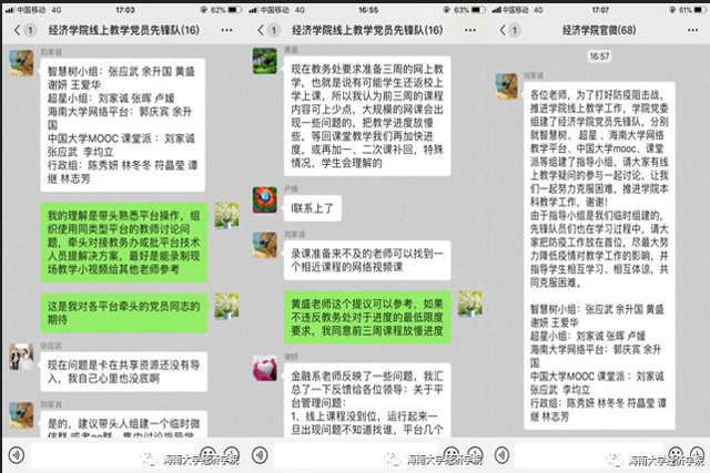在学校发布《关于调整2019-2020学年第二学期本科教学工作安排的通知》后,关于线上教学组织和管理工作的问题接踵而来。为确保此项工作顺利推进,海南大学经济学院党委牵头依托学院本科教学指导委员会、本科教学督导组、教务办公室以及部分优秀党员教师组建了“经济学院线上教学帮扶党员先锋队”,充分发挥党员先锋模范带头作用,积极推动学院线上教学的组织与管理工作。