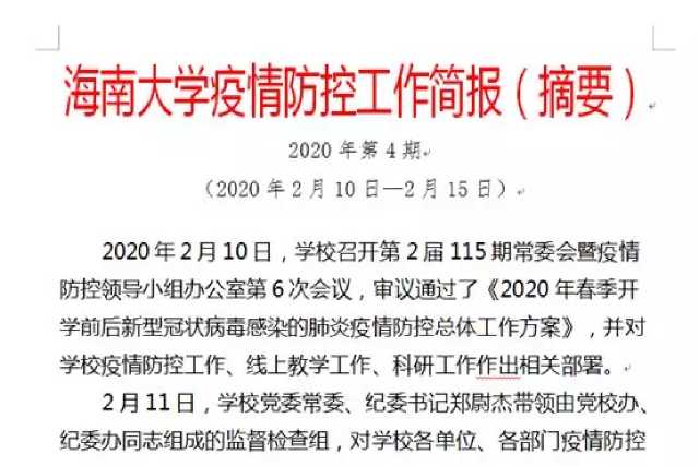 强化物资保障、加强物资调度,确保防控一线防护物资供应到位,是王崇敏同志时刻强调的人文关怀。为此,他协调发放口罩2万余个,消毒药品、红外测温仪一批,并安排设置学校医学观察隔离区,目前已科学处置留观师生100余人。为了更好地防控疫情,他采取种种有力有效的举措:强化源头防控措施,确保留校师生饮食安全,严格落实外地返琼人员居家隔离措施,坚决阻断传染源,指导编印海南大学疫情防控工作简报四期,疫情专报两期,发送各类提示信息和通知400余条,为全校师生坚定必胜信念、科学防控提供可靠信息渠道……为校园安全筑起一道道坚固的防线。