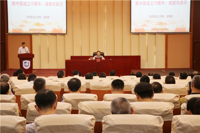 9月28日上午,海南大学“不忘初心、牢记使命”主题教育读书班集中学习专题报告会在社科楼二楼报告厅举行。马克思主义学院涂刚鹏副教授作题为《新中国成立70年:成就与启示》的专题报告。校党委常委、宣传部部长谭勇主持报告会。
