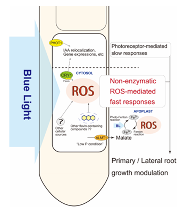 拟南芥是植物生理学和分子遗传学研究中最重要的模式植物之一。在对拟南芥的基础研究中,实验室往往用透明的玻璃或塑料培养皿培养这种模式生物,并没有考虑到根在光照中形成的表型差异。万迎朗教授在和他博士导师、德国波恩大学Frantisek Baluska教授的长期合作研究中发现了对拟南芥培养时,对根部光照与遮蔽条件不同可能改变包括植物光受体蛋白在内的多种基因表达变化,以及引起根细胞中的羟基自由基等活性氧组分(ROS)的上升,从而引起主根生长、侧根和根毛发育表型的显著差别。基于万迎朗教授与Baluska教授在拟南芥根部避光培养方面的长期研究,《Molecular Plant》杂志社特邀请写作综述评论。在综述中提出,拟南芥在长期进化过程中,根部已经形成了适应黑暗环境能力。实验室中对拟南芥根部的附加光照实际形成对根的胁迫:一方面,光化学反应中形成的ROS可能对根的正常生长产生干扰和抑制;另一方面,根部分布的光受体也可能引发根的胁迫应答,必须谨慎评估过去在完全透明的培养皿中所获得与植物根生长相关的实验结论,并在未来的实验中推荐采用根部遮光的培养设备。