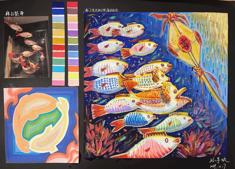 展览以《视觉语言》(张哲指导)、《字体设计》(艾敏指导)、《海报设计》(艾敏指导)三大核心课程为主线,展出大一至大三学生作品,既有基础造型的点线面研究,亦有对社会议题的视觉回应。课程指导教师张哲和艾敏谈到,展览旨在呈现“理性训练与感性认知交织的设计生态”,并通过对海南地域文化基因的视觉转译,探索传统与现代的对话路径。