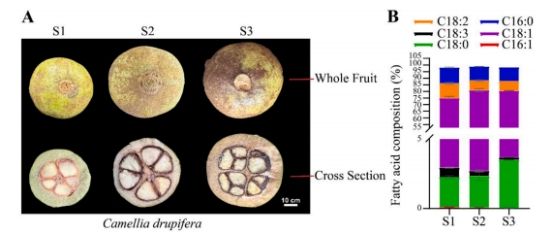 图1.油茶(C.drupifera)种子在不同发育阶段的脂肪酸组成观察与测定。(A)油茶的三个发育阶段。(B)发育中种子的脂肪酸组成。C16:0为棕榈酸;C16:1为棕榈油酸;C18:0为硬脂酸;C18:1为油酸;C18:2为亚油酸;C18:3为亚麻酸。