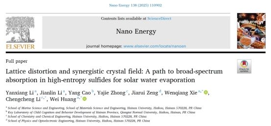 近日,海南大学黄玮和谢文强等人在《Nano Energy》期刊上发表最新研究成果,提出一种“晶格畸变与协同晶体场”调控策略,为高效光热材料的设计提供了新思路。该研究对高熵硫化物的光热转换机制进行了深入探讨,对太阳能界面蒸发技术的发展具有积极推动意义。