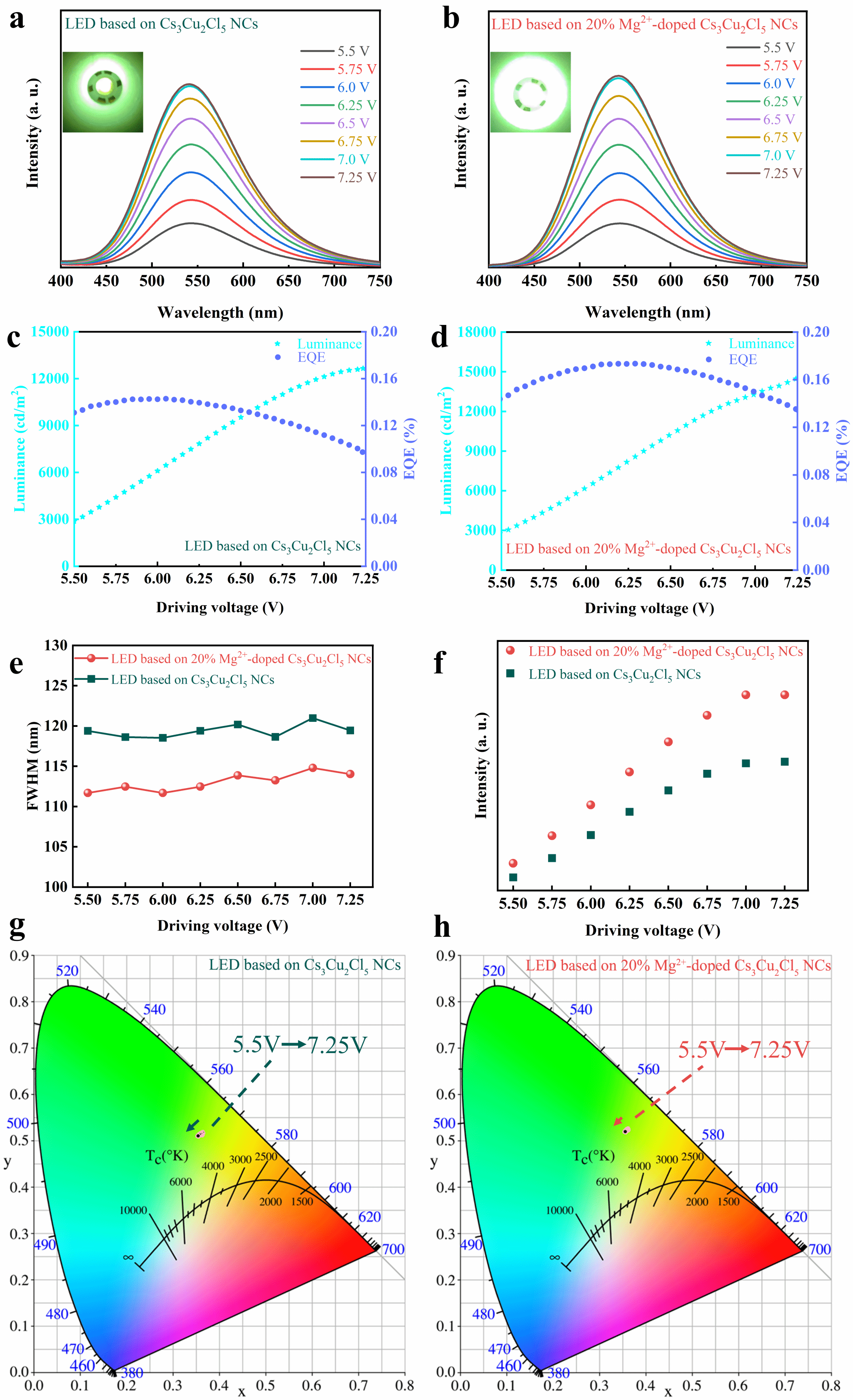 图 1. 基于Mg2+掺杂后的Cs3Cu2Cl5纳米晶制备绿光LED的器件表现。