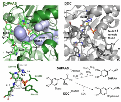 图2. Comparison of DHPAAS and L-DOPA decarboxylase crystal structures and reactions.