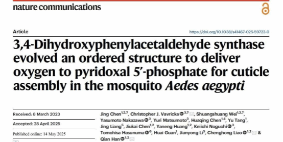 2025年5月15日,海南大学生命健康学院病媒生物学团队在《Nature Communications》上发表了题为“3,4-Dihydroxyphenylacetaldehyde synthase evolved an ordered structure to deliver oxygen to pyridoxal 5’-phosphate for cuticle assembly in the mosquito Aedes aegypt”的重要研究成果。该研究深入剖析了多巴醛合成酶(3,4-Dihydroxyphenylacetaldehyde synthase)在昆虫软表皮形成中的关键作用、生理功能以及独特的分子机制,成功揭示了吸血昆虫能够超大吸血量的奥秘。