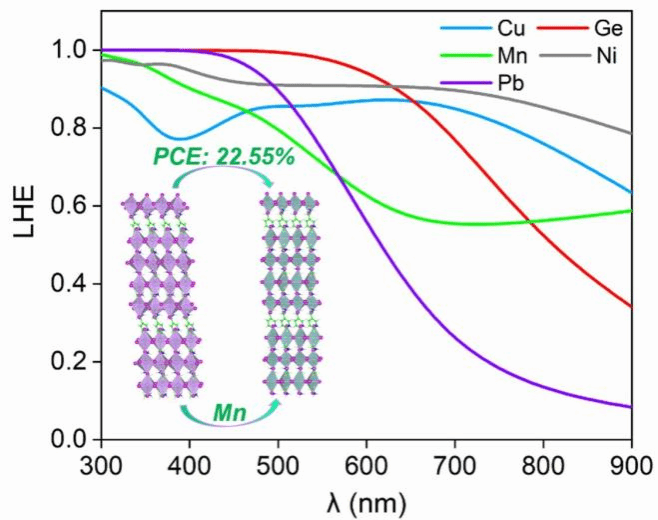 二维(2D)Dion-Jacobson(DJ)钙钛矿因其出色的刚性结构和比2D Ruddlesden-Popper(RP)钙钛矿更优越的环境稳定性而成为新兴的光伏材料。在本文中,我们采用3-(氨甲基)吡啶(3AMPY)作为二价层间间隔物,以减轻铅的毒性并探索更具潜力的DJ替代品。通过第一性原理计算,研究了无铅DJ钙钛矿(3AMPY)(MA)3M4I13的光电和光伏性能,其中中心金属考虑用Ba、Cd、Cu、Ge、Mg、Mn、Ni、Sn和Zn替代Pb。研究结果表明,引入Mn、Cd、Ni和Ge可以将带隙有效调整到适用于太阳能电池的理想范围0.90–1.60 eV。值得注意的是,(3AMPY)(MA)3Ni4I13展现出最优异的光学响应能力,在紫外-可见光范围内光采集效率保持在80%。而(3AMPY)(MA)3Ge4I13显示出最出色的载流子传输性能,其电子迁移率高达555.43 cm² V⁻¹ s⁻¹,相较于其他二维钙钛矿具有显著优势。预测的光伏性能显示,(3AMPY)(MA)3Mg4I13有最大的开路电压(VOC, 2.12 V),(3AMPY)(MA)3Ge4I13具有最高的短路电流密度,(3AMPY)(MA)3Mn4I13具有超过22 %的光电转换效率。该工作为设计无铅2D DJ钙钛矿材料提供了研究思路。