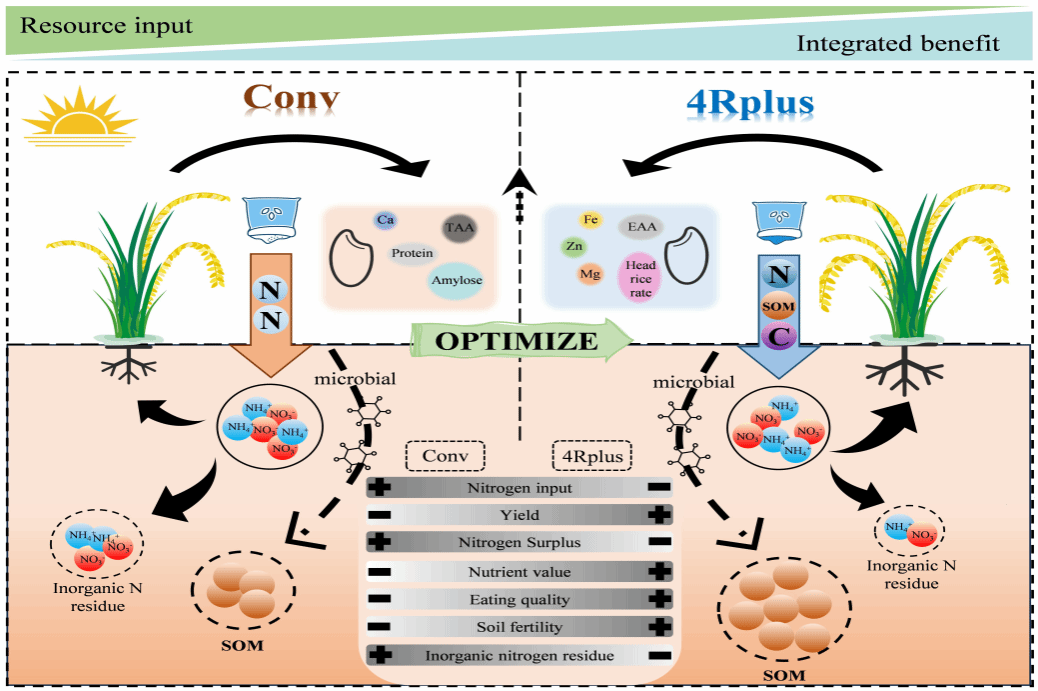 本研究聚焦热带稻田土壤质量退化、氮肥利用效率低、稻米品质下降等核心问题,历时三年开展田间定位试验,创新性地集成有机肥、控释肥、稳定性肥料与“4R”营养管理策略(适量、适时、适源、适位),并在田间系统验证,取得如下亮点成果:
