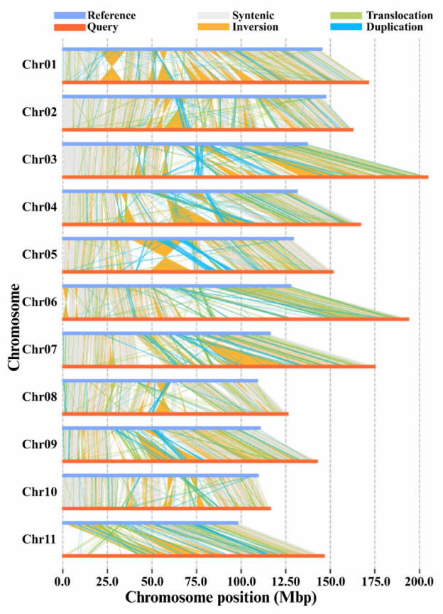共线性分析揭示了燕窝果与普通二倍体火龙果基因组中存在广泛的结构变异,包括大片段倒位、易位、重复(图5)。通过将同源四倍体燕窝果与二倍体火龙果进行比较,研究者鉴定出41,409个存在-缺失变异(PAVs)、82,394个PAVs、1,245个倒位、15,725个易位、23,325,494个SNPs、2,294,810个插入缺失变异以及19,928个拷贝数变异(CNVs)。这些结构变异主要分布在基因间区,其中燕窝果包含31,506-66,158个PAVs、710个倒位、13,533个易位以及14,890个CNVs。