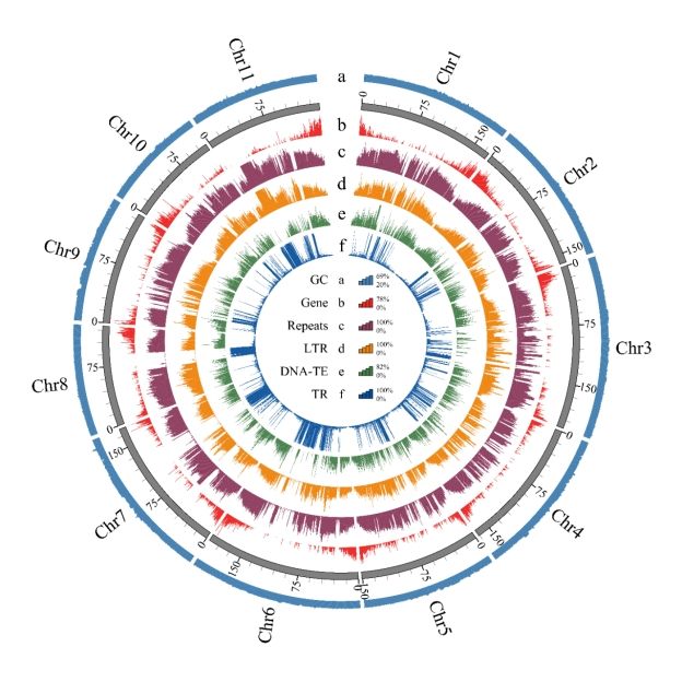 利用PacBio HiFi和Hi-C测序数据,研究者我们成功组装了燕窝果的高质量染色体级别基因组(1.79 Gb,11条染色体),锚定率达到97.73%,共鉴定出27,246个基因,锚定率达到97.73%(图2)。其姊妹物种——火龙果(Selenicereus undatus)为二倍体基因组,大小约1.41 Gb 。