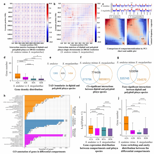 Hi-C互作分析表明,四倍体燕窝果中A-A和B-B区室间的相互作用更为强烈,同时呈现出独特的拓扑关联结构域(TAD)边界特征。研究者在四倍体燕窝果中鉴定出1,454个特异性TADs,在二倍体中则发现1,395个特异性TADs,表明两种倍性火龙果在三维基因组结构上存在显著差异(图4)。值得注意的是,哺乳动物的TADs形成依赖于特定的结构蛋白[1],而植物虽然缺乏这类蛋白,但其携带的TCP家族转录因子(如TEOSINTE BRANCHED 1、CYCLOIDEA和PCF1等)可能发挥着类似的功能[2]。