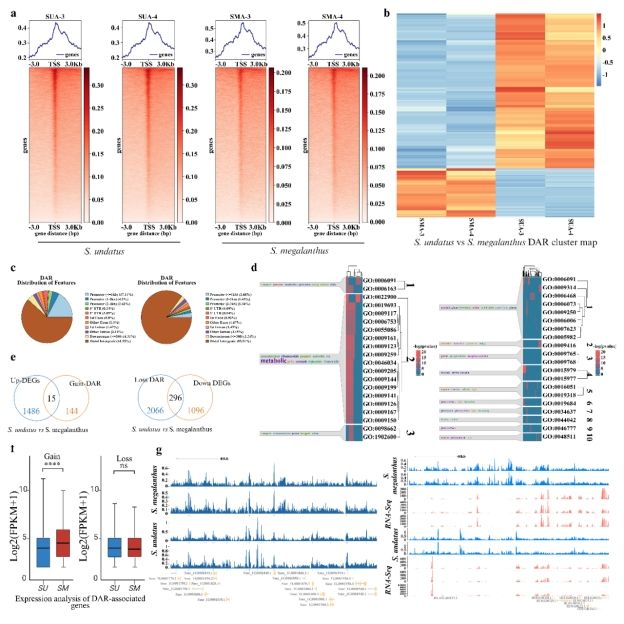 ATAC-seq分析显示,二倍体火龙果的染色质可及性更高,数千个差异可及区域与启动子区域重叠,并涉及ATP代谢、胁迫响应和光合作用相关基因(图7)。通过DiffBind工具比较发现,两个物种间存在13,977个差异可及区域(DARs),其中3,355个为获得性DARs,10,622个为缺失性DARs。DAR信号值的聚类分析揭示了物种间的显著差异。进一步对启动子关联的DARs分析表明,火龙果与燕窝果相比,获得性DARs关联159个基因,而缺失性DARs则关联2,362个基因。