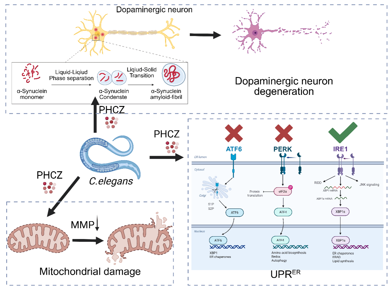 卤代咔唑是一类来源于自然和人工合成过程的持久性有机污染物,具有高稳定性和生物富集性,但其神经毒性机制仍缺乏深入认识。本研究以模式生物秀丽隐杆线虫为对象,系统评估了卤代咔唑的整体毒性和神经毒性。结果显示,卤代咔唑暴露可显著诱导多巴胺能神经元退化,并引起个体发育迟缓及雄性生殖细胞受损。机制研究表明,卤代咔唑能够促进帕金森病相关蛋白α-突触核蛋白发生液-液相分离,并降低其形成凝聚体的流动性,从而加剧其向淀粉样原纤维转化,损伤多巴胺能神经元。进一步研究发现,卤代咔唑暴露可特异性激活IRE-1信号轴介导的内质网未折叠蛋白反应同时损伤线粒体功能,加剧神经退行性病变。本研究首次揭示了多卤代咔唑通过干扰蛋白质液液相分离及内质网应激途径诱导神经毒性的分子机制,为认识新型环境污染物的神经健康风险提供了新的科学依据。