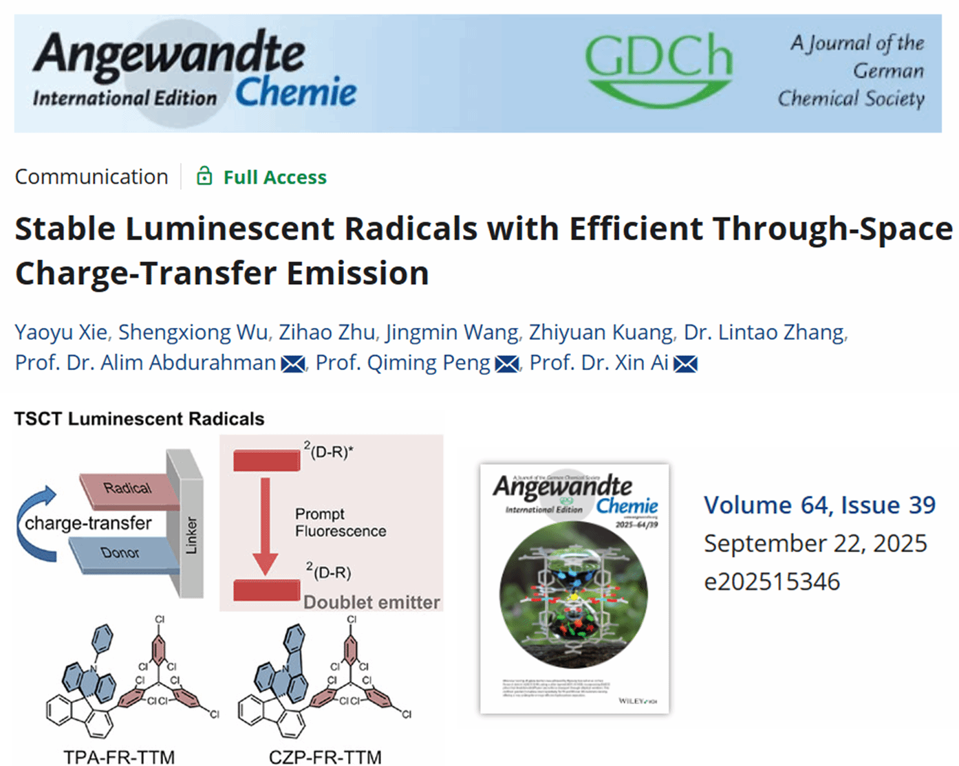 近日,海南大学材料科学与工程学院艾心教授团队首次报道了基于空间电荷转移激发态的高发光效率自由基材料,相关研究工作以“Stable Luminescent Radicals with Efficient Through-Space Charge-Transfer Emission”为题作为VIP论文在国际高水平学术期刊Angewandte Chemie International Edition发表。海南大学博士研究生谢遥宇、硕士研究生吴胜雄为论文的共同第一作者,海南大学艾心教授、吉林大学阿力木教授和南京工业大学彭其明教授为论文的共同通讯作者,论文的第一完成单位为海南大学材料科学与工程学院。