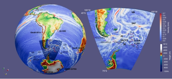 图1:本图展示当今全球海洋表层环流分布,暖红色调代表较高流速。黑色线条标注南极绕极流(ACC)从北至南的五条主要锋面。红色线标记德雷克海峡(DP45)附近的Jason-104卫星测高轨迹。左图阴影区域为本研究重点关注区(详见右图局部放大)。