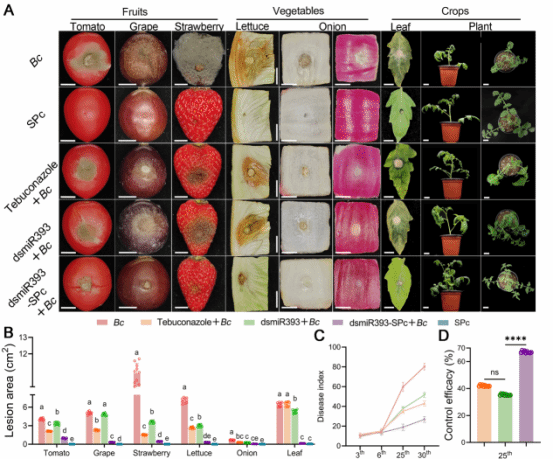 实验表明,该技术中使用的星形聚合物纳米载体,能将核心分子dsmiR393在RNA酶环境下的降解半衰期延长6倍,并使其在菌体和植物中的递送效率提升35%-65%(图2)。加载了纳米载体的dsmiR393在番茄、草莓、葡萄等多种作物上对灰霉病的防治效果高达90%,其防控效率与持效性均显著优于传统化学农药(图3)。