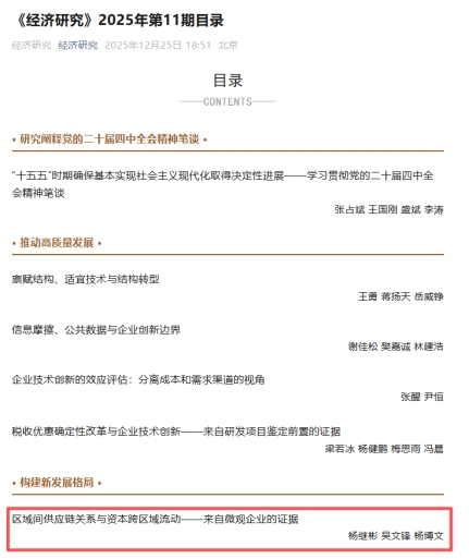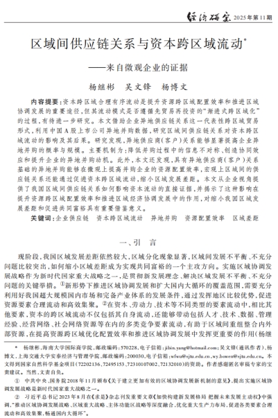 近日,海南大学国际商学院教师杨继彬以第一作者身份,与上海交通大学吴文锋教授和杨博文助理研究员在2025年第11期《经济研究》上发表题为“区域间供应链关系与资本跨区域流动——来自微观企业的证据”的学术论文。《经济研究》期刊是国内公认的经济管理类顶级期刊。此论文为杨继彬副教授近五年来以第一作者身份在《经济研究》发表的第二篇论文。