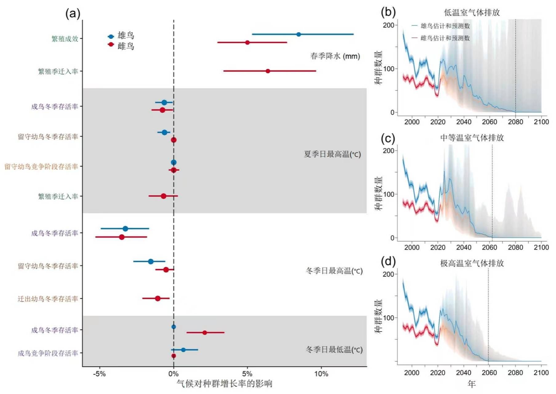 常见种的数量减少和灭绝往往会对生态系统的结构和功能稳定性产生极大的影响。虽然大量研究表明很多常见种当前正在经历快速衰退,但学界尚不清楚这是否、以及多快会导致种群灭绝。以往物种的快速灭绝多源于人类过度利用、外来捕食者引入以及栖息地破坏。当前的气候变化加剧了这些威胁,并带来了新的风险。然而,气候变化是否会导致物种快速灭绝,目前仍不明确。吕磊研究员及其合作者利用华丽细尾鹩莺(Malurus cyaneus)长达30年(1993–2022)的个体繁殖、表观存活、迁入和种群数量数据,使用整合种群模型(Integrated Population Model)和路径分析,定量评估了气候如何通过影响各个种群统计参数进而决定种群动态,并预测了该种群在未来气候变化情景下的生存力。研究表明,气候可通过多达11个种群统计参数的路径影响雌性和雄性鹩莺的种群动态。春季降水越多,繁殖成效和雌性幼鸟的迁入率越高,会促进种群增长。然而,夏季和冬季的日最高温越高,成鸟以及对极端气候更敏感的幼鸟在冬季的存活率越低,最终限制种群增长。鉴于构建的种群模型能够高度拟合实际调查到的种群数量,本研究进一步预测了华丽细尾鹩莺未来的种群动态。综合21个气候模型的气候随机性,并同时考虑种群密度制约和统计随机性后,研究发现,在分别代表未来气候变暖逐级加剧的低、中等和极高温室气体排放情景下,种群均将急剧衰退并快速灭绝,且排放越高,灭绝发生得越早。