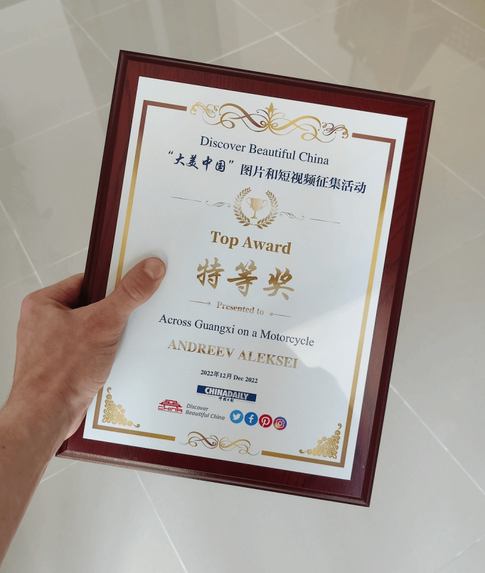 (Andreev Aleksei在中国日报社主办的“大美中国”短视频大赛中斩获的特等奖奖牌)
