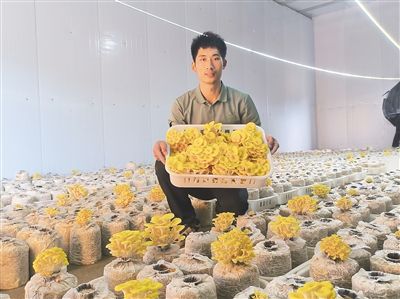海南众研农业科技有限公司总经理廖万杰。廖万杰团队培育的榆黄菇。