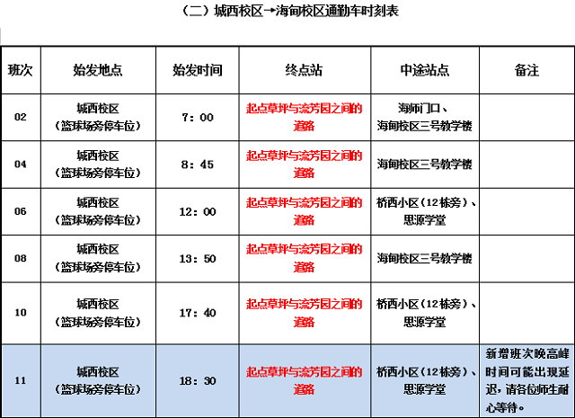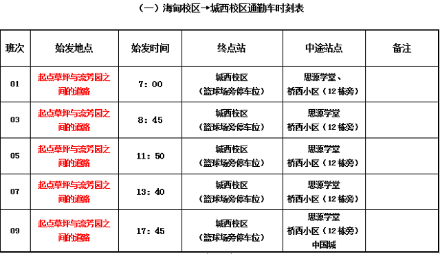 海甸校区与城西校区通勤车运行时刻表