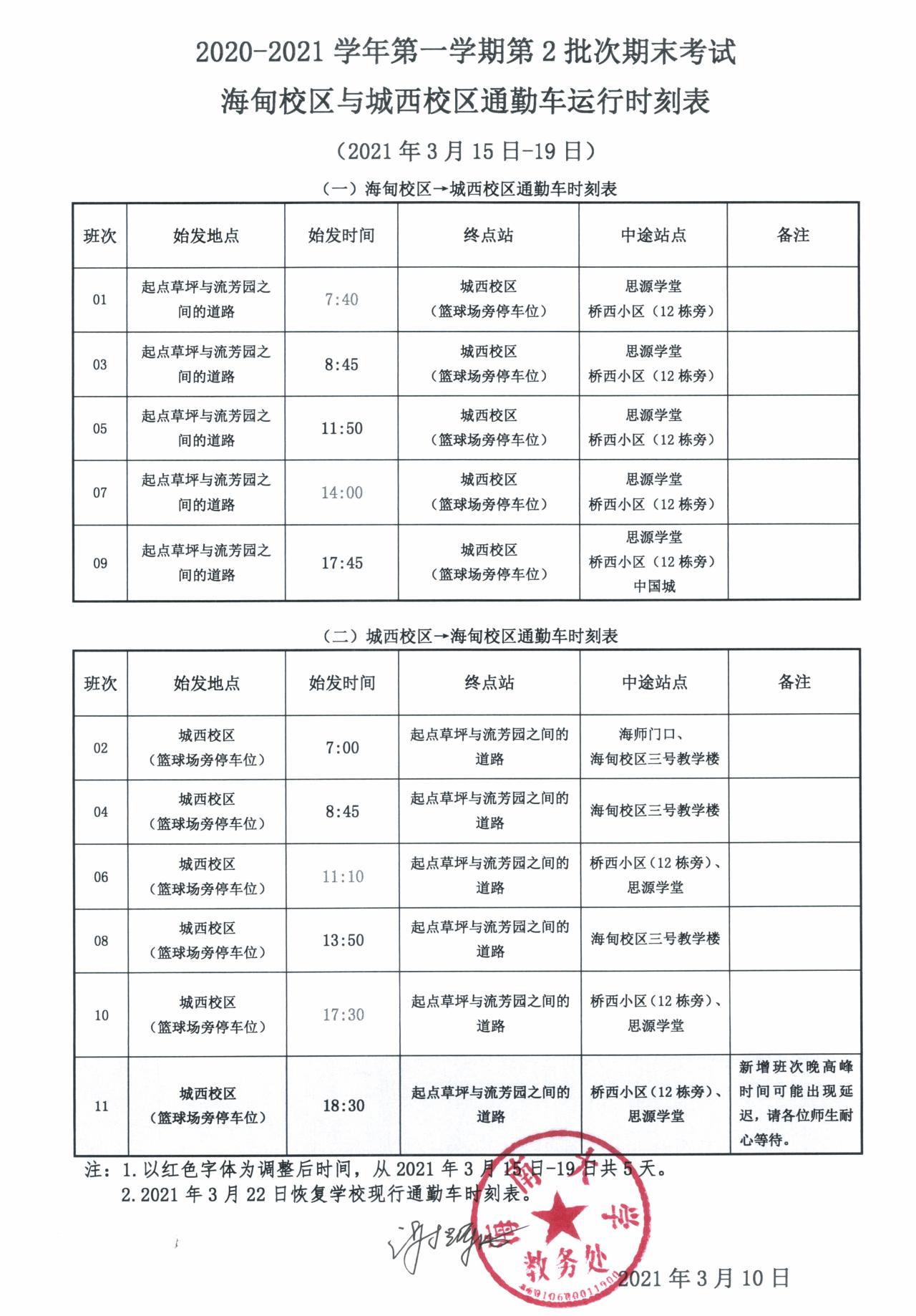 2020-2021学年第一学期第2批次期末考试海甸校区与城西校区通勤车运行时刻表